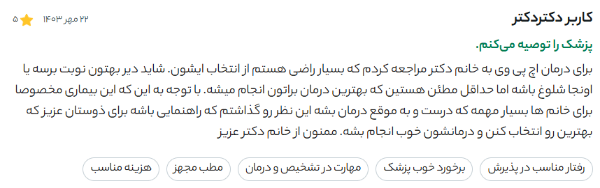 بازخوردهای بیماران قبلی و رضایت آن ها یکی از عوامل انتخاب متخصص زگیل تناسلی در مشهد است. شهرت و نظرات مثبت بیماران به بیمار کمک می کند تا انتخاب بهتری داشته باشد.