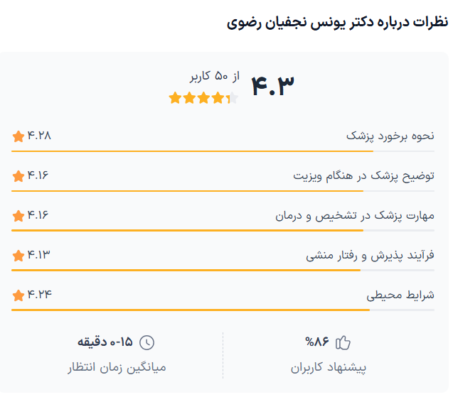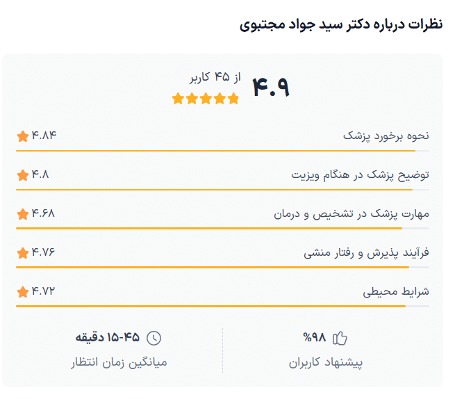 در این مقاله 5 تا آدرس بهترین دکتر طب سوزنی در مشهد را که منتخب مراجعین امسال و همشهری های مشهدی بودند را بررسی کردیم. همچنین نمونه های منتشر شده و نظرات مراجعین را برای هر پزشک دیدید. می توانید امتیاز بندی نهایی جدول زیر را به عنوان جمع بندی مقاله “بهترین دکتر طب سوزنی در مشهد” در نظر بگیرید.