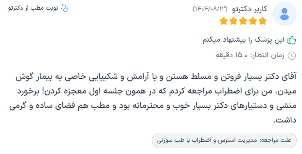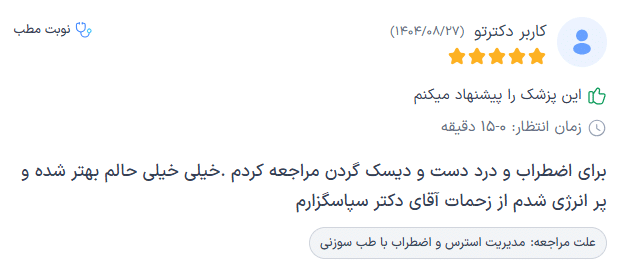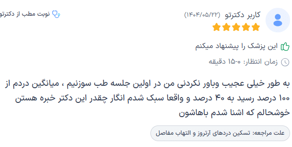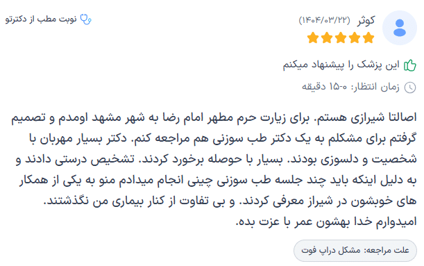 در این مقاله مرجع، به معرفی بهترین دکتر طب سوزنی در مشهد پرداخته ایم. این فهرست شامل آدرس بهترین دکتر طب سوزنی در مشهد است که با بررسی دقیق نظرات مثبت و منفی بیماران و تجربیات واقعی، به صورت کامل و کاربردی گردآوری شده است. شما در ادامه می توانید اطلاعات تماس، نمونه کارها، هزینه ها و تجربیات واقعی مراجعه کنندگان برای بهترین دکتر تخصصی بالینی طب سوزنی مشهد را مشاهده کنید.
