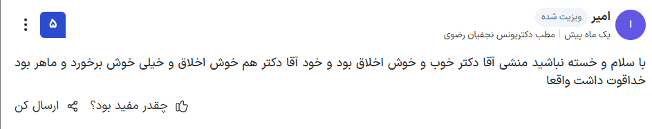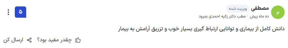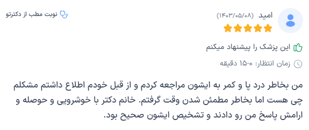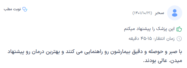 شهرت پزشک بین بیماران و پزشکان جامعه طب سوزنی بسیار مهم است. بهترین دکتر طب سوزنی در مشهد باید از شهرت بالایی برخوردار باشد. درمان های اثربخش و رضایت بیماران قبلی از پزشک یکی دیگر از ویژگی های پزشک طب سوزنی است.